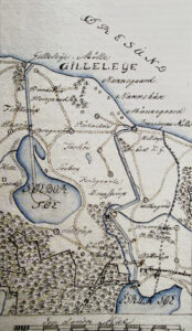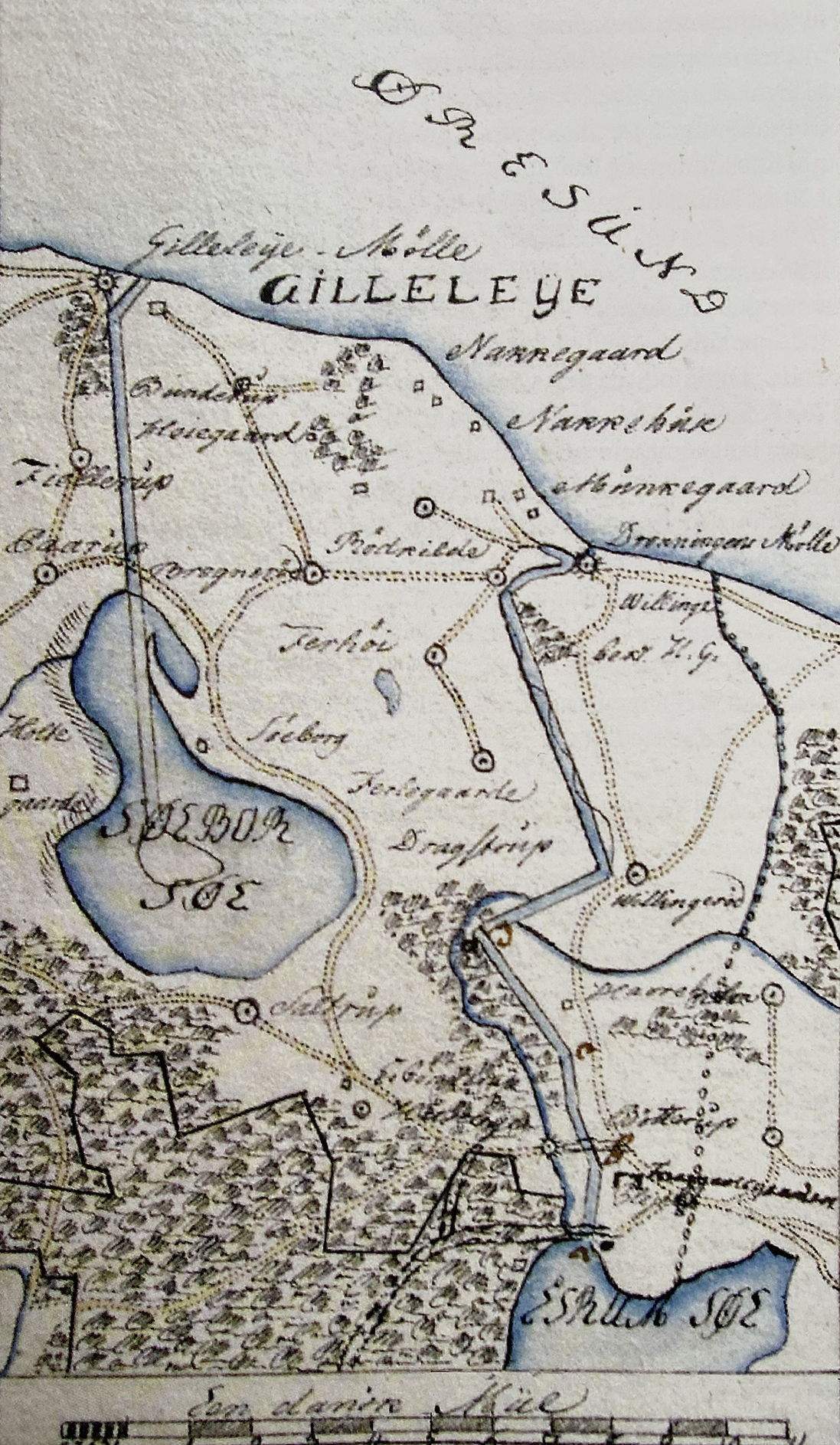 Billedet viser justitsråd Prams første skitse fra 1806 af Esrum Kanal. Kilde: Rigsarkivet.